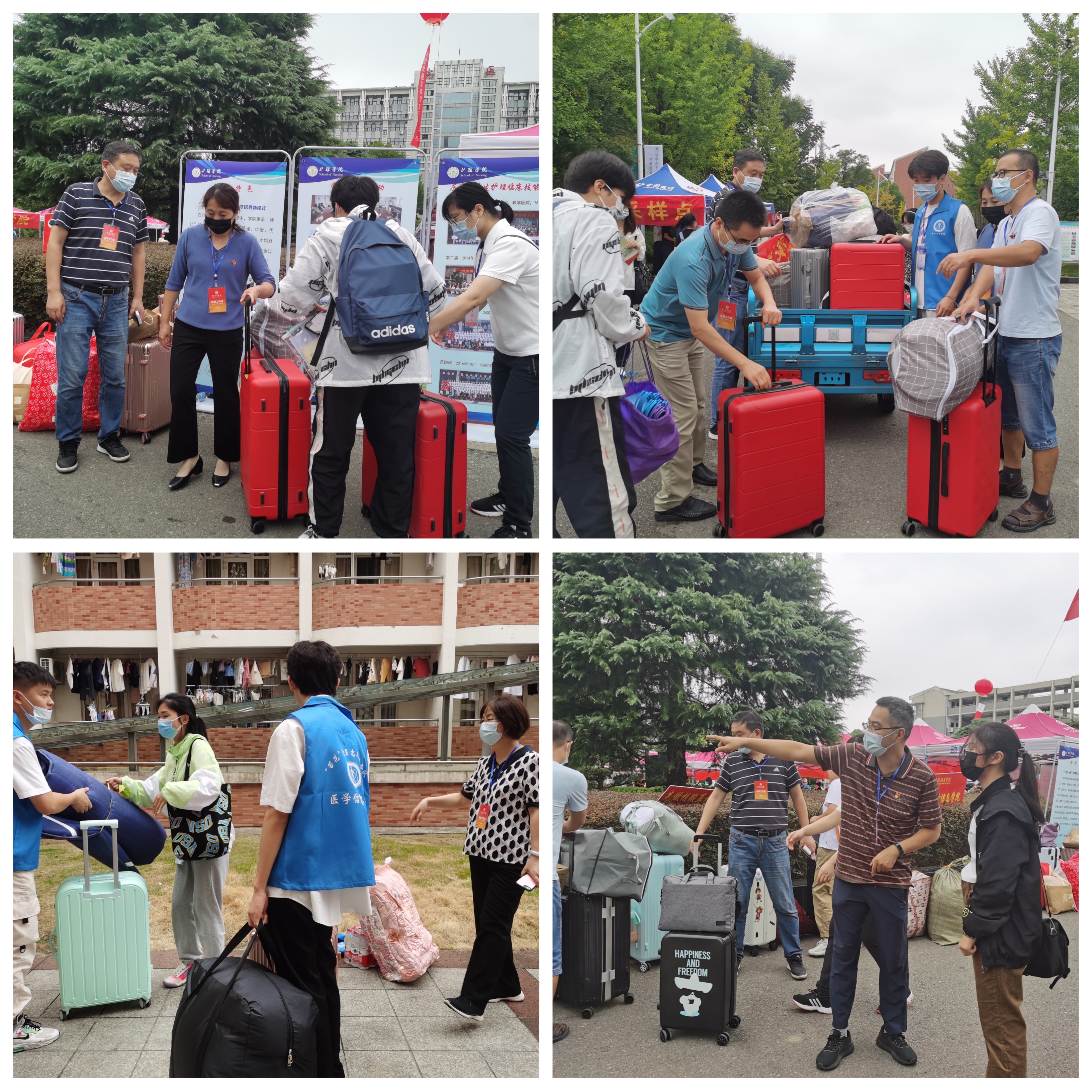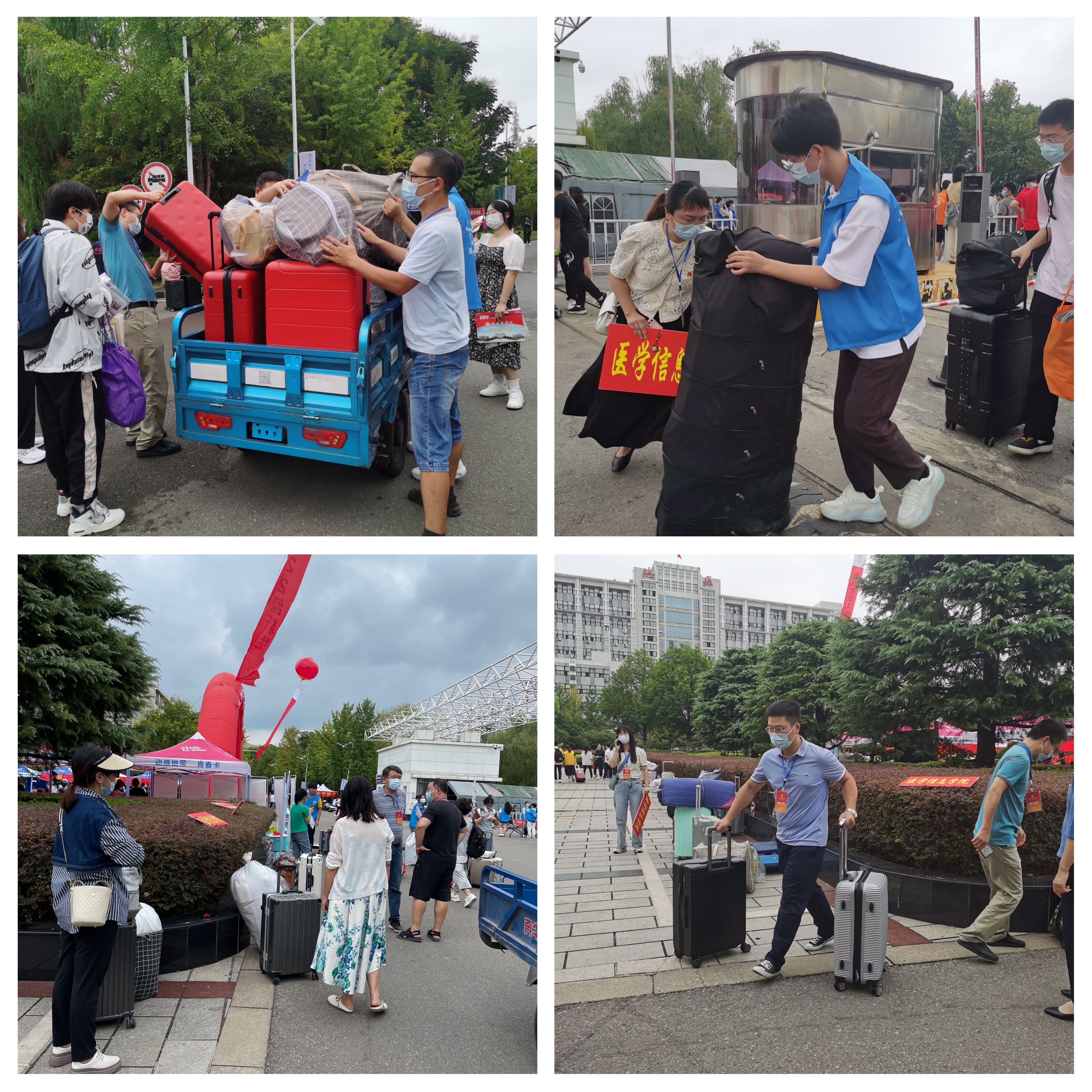 校园内外彩旗飘扬,迎新标语随风招展,宣传标语温馨醒目。来自五湖四海的2022级新生拎着溢满青春梦想的行李箱走进校园。机关党委国资处党支部党员志愿者、本院师生志愿者共同协作,为新生提供全方位服务,主动引导学生报到,介绍医学信息学院专业特色,宣传讲解“绿色通道”政策,耐心解答学生疑问,积极帮助学生搬运行李,他们用行动践行初心,党员志愿者充分发挥了模范带头作用。迎新现场秩序井然,各项工作有条不紊。