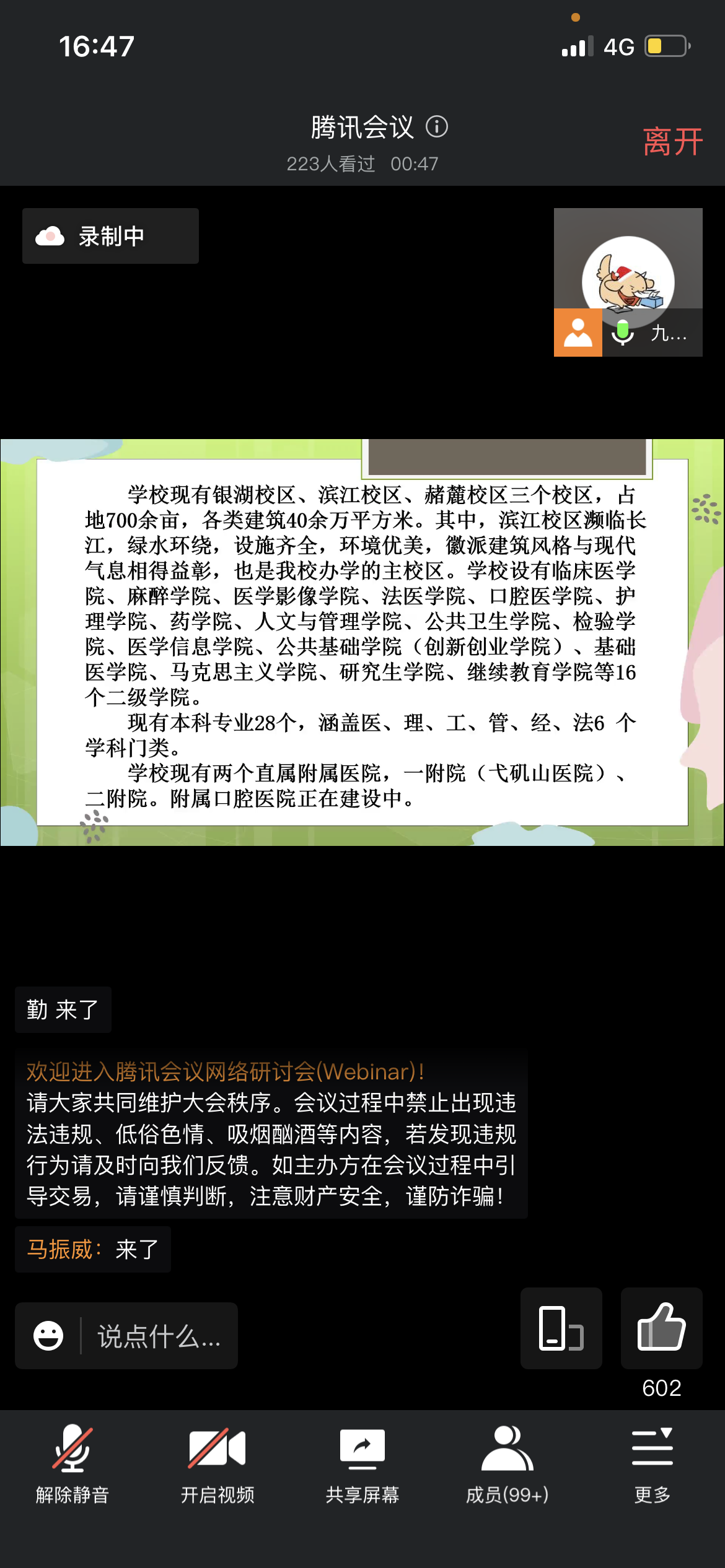 医学信息学院党总支书记刘影于9月4日下午,采取线上线下相结合的方式,开展了面向全院师生的“开学第一课”。刘影首先对皖南医学院和医学信息学院的具体情况进行了介绍,包括校区分布、专业课程设置、就业面向、师资力量等。随后借优秀学子风采展示鼓励新生在之后的大学生活中积极参与各种竞赛与活动,丰富自己的阅历,提升自身的内涵。刘影对所有学生提出了几点要求,一是遵守法律法规、校纪校规;二是诚实守信,遵守老师教诲;三是端正学习态度;四是积极参加各项活动;五是遇到突发情况,务必及时与学院和老师联系。