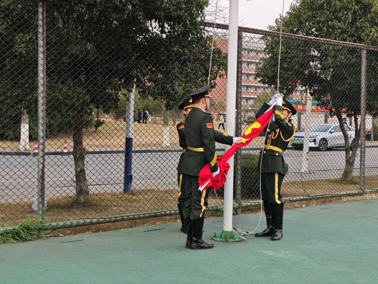 清晨7时10分,国旗护卫队身着统一制服,以铿锵步伐护送五星红旗抵达升旗台。伴随着激昂的《义勇军进行曲》,全体师生肃立注目,高唱国歌,五星红旗冉冉升起、迎风飘扬,爱国情怀与青春理想在国旗下交融激荡。