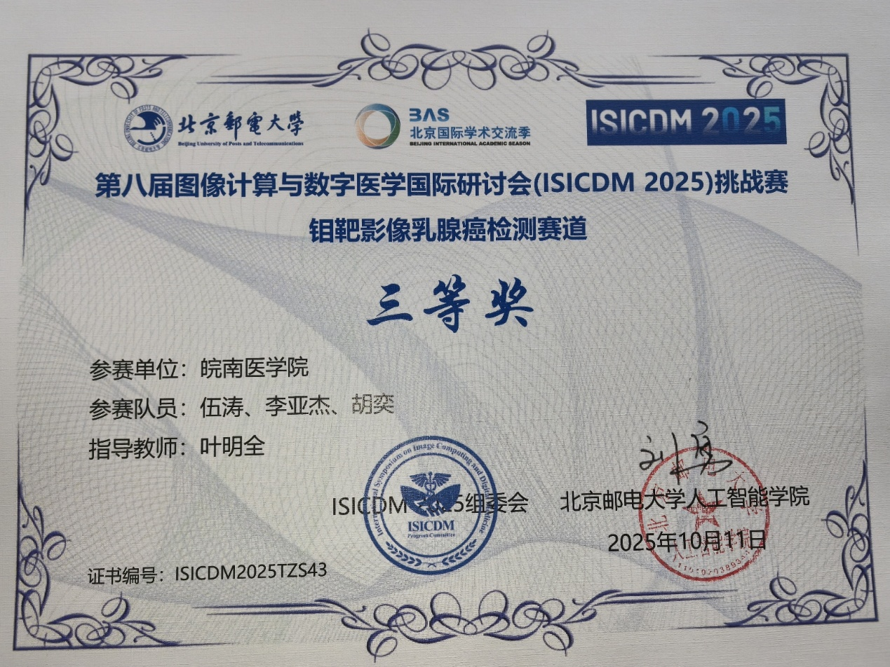 2025年10月10日-12日,由国际数字医学会主办、北京邮电大学承办以及清华大学、北京大学、电子科技大学、北京理工大学、北京航空航天大学、首都医科大学、北京科技大学等单位协办的第八届图像计算与数字医学国际研讨会(ISICDM 2025)在北京成功召开。此次大会举办了五个主题赛道的医学影像人工智能挑战赛,每个主题赛道设一等奖、二等奖、三等奖各1项。医学信息学院2025级人工智能专业硕士生伍涛等5名同学组成两个团队经过精彩激烈的角逐,凭借技术创新方案和专业综合素养,获得了评委的高度评价,获得三等奖各1项。