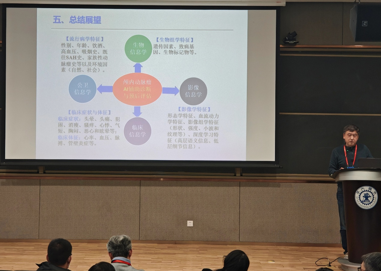 叶明全应邀在“数据驱动的疾病诊断与精准医疗”分会场作“人工智能辅助颅内动脉瘤临床诊断与预后评估”学术报告,系统介绍了团队在颅内动脉瘤医学影像智能挖掘、多模态医学数据融合与预后评估模型构建方面的最新研究成果,引发了与会专家的广泛关注与热烈讨论。
